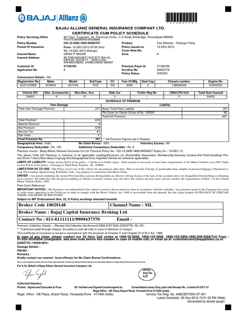 Bajaj Allianz Third Party Bike Insurance Policy Sample Liability Insurance Insurance