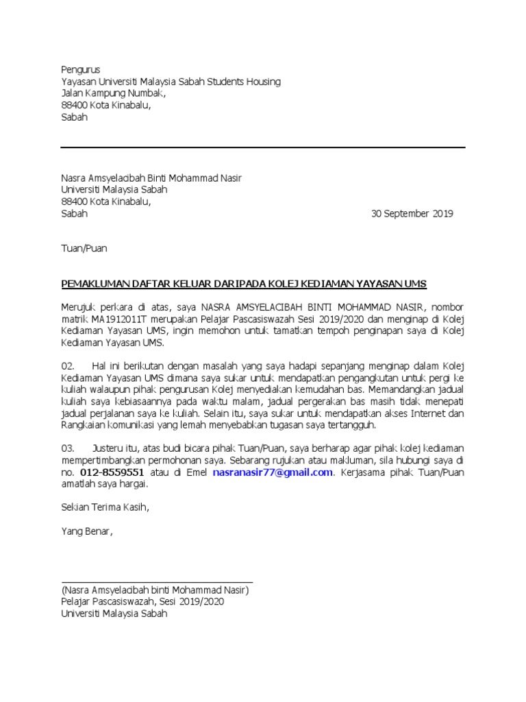 Kolej Contoh Surat Rasmi Berhenti Belajar