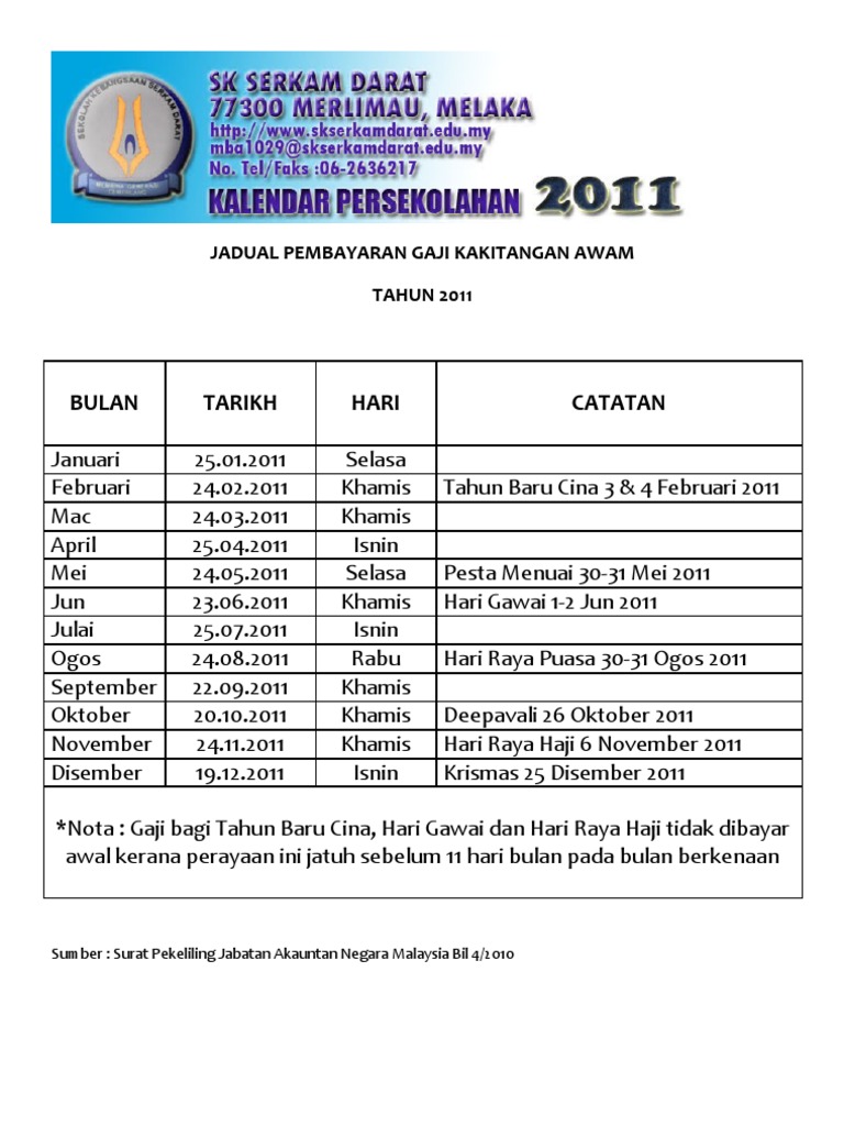 Bulan Tarikh Hari Catatan Jadual Pembayaran Gaji Kakitangan Awam Tahun 2011