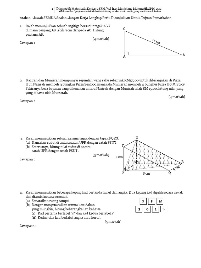 1 Diagnostik Matematik Kertas 2 Spm 18 Hari Menjelang Matematik Spm 2015