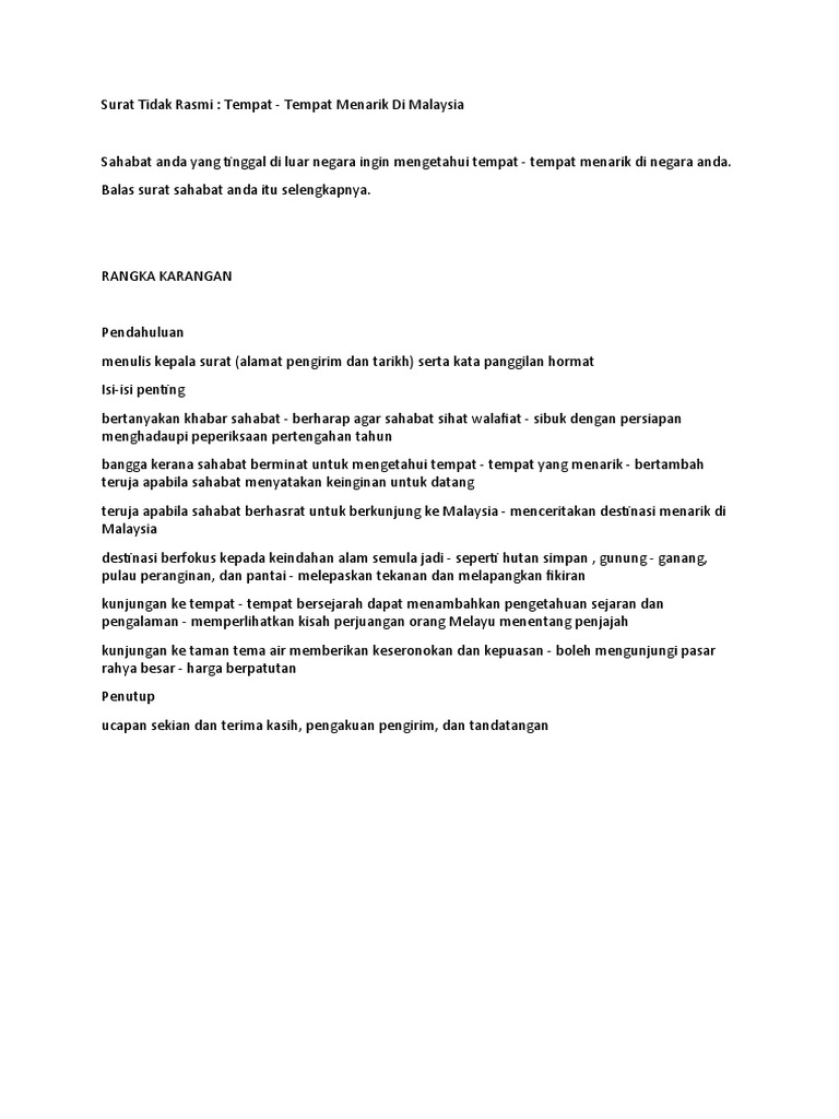 Karangan Surat Tidak Rasmi Tentang Tempat Menarik Di Malaysia