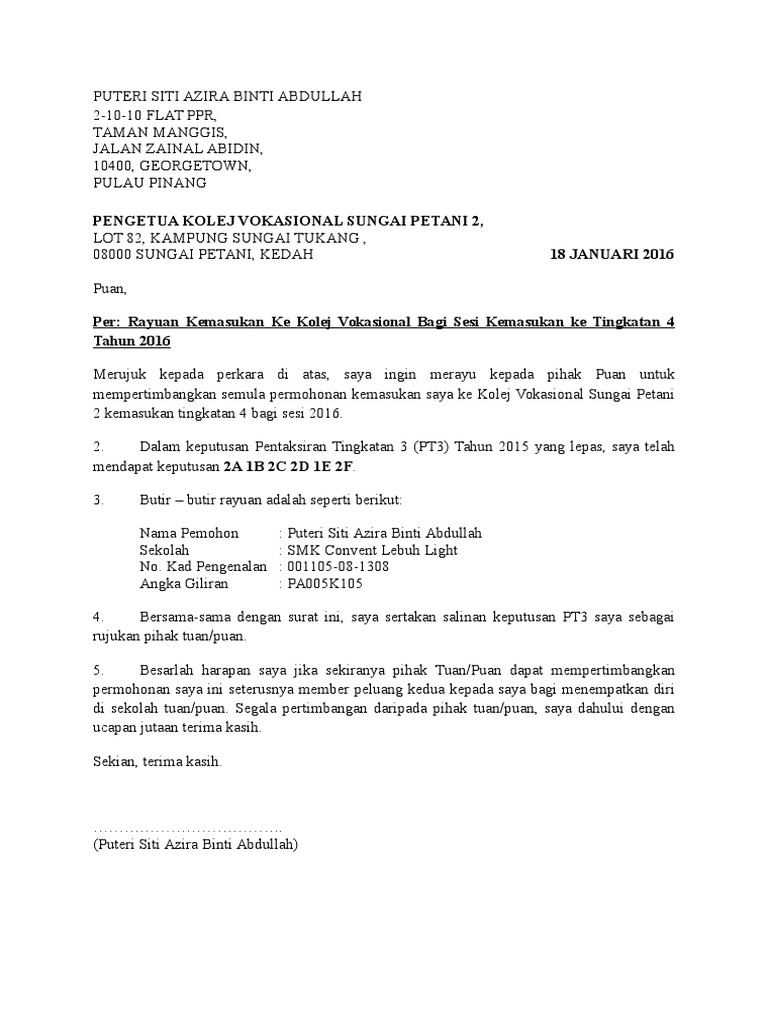 Contoh Surat Rayuan Kolej Vokasional