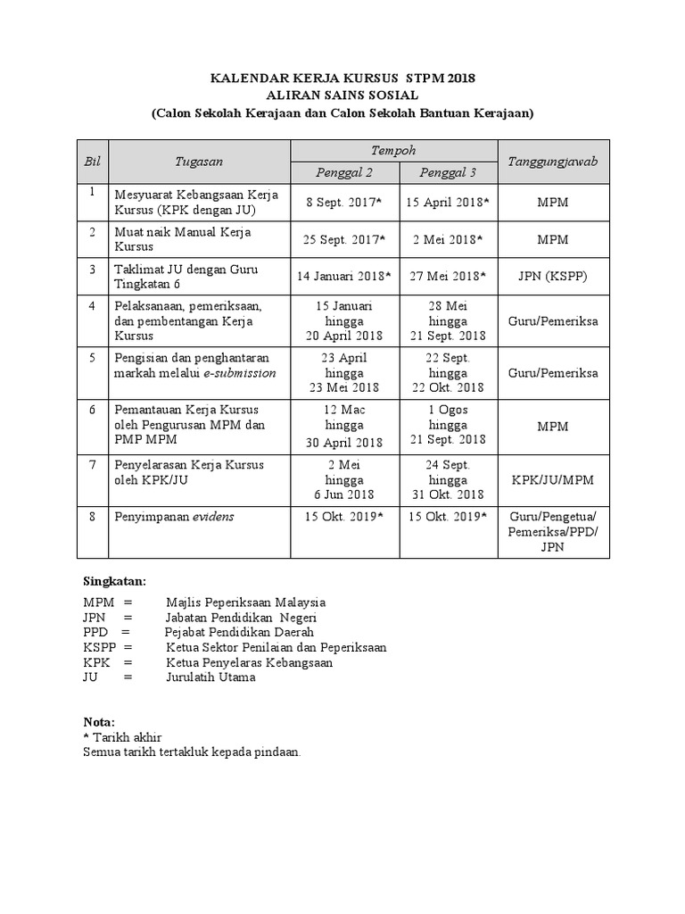 Kalendar Kerja Kursus Stpm 2018 Sek Kerajaan Kemas Kini 1 Mac Pdf