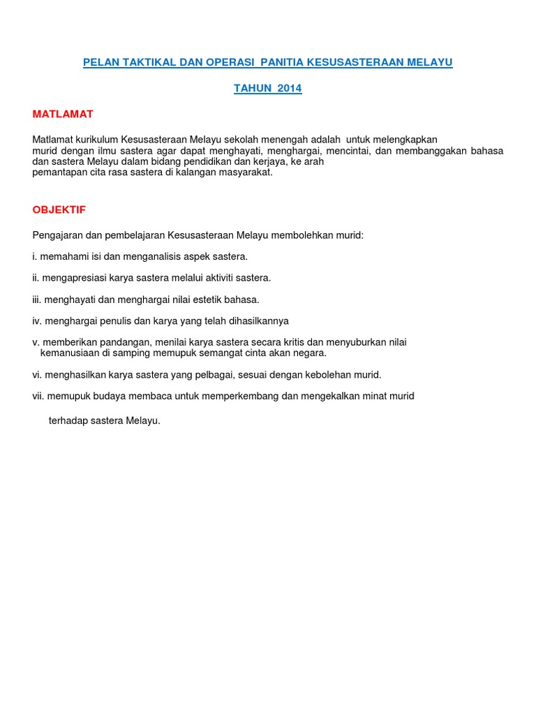 Contoh Pelan Taktikal Panitia Sastera Melayu 2014