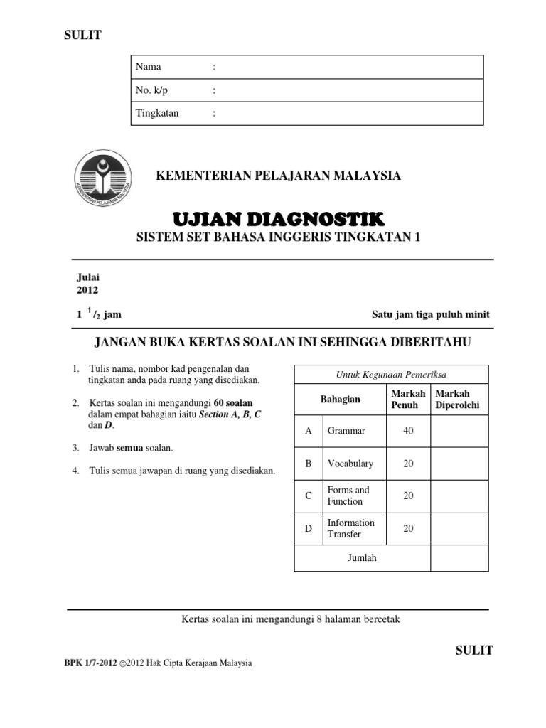 Kertas Soalan Bahasa Inggeris Tingkatan 1