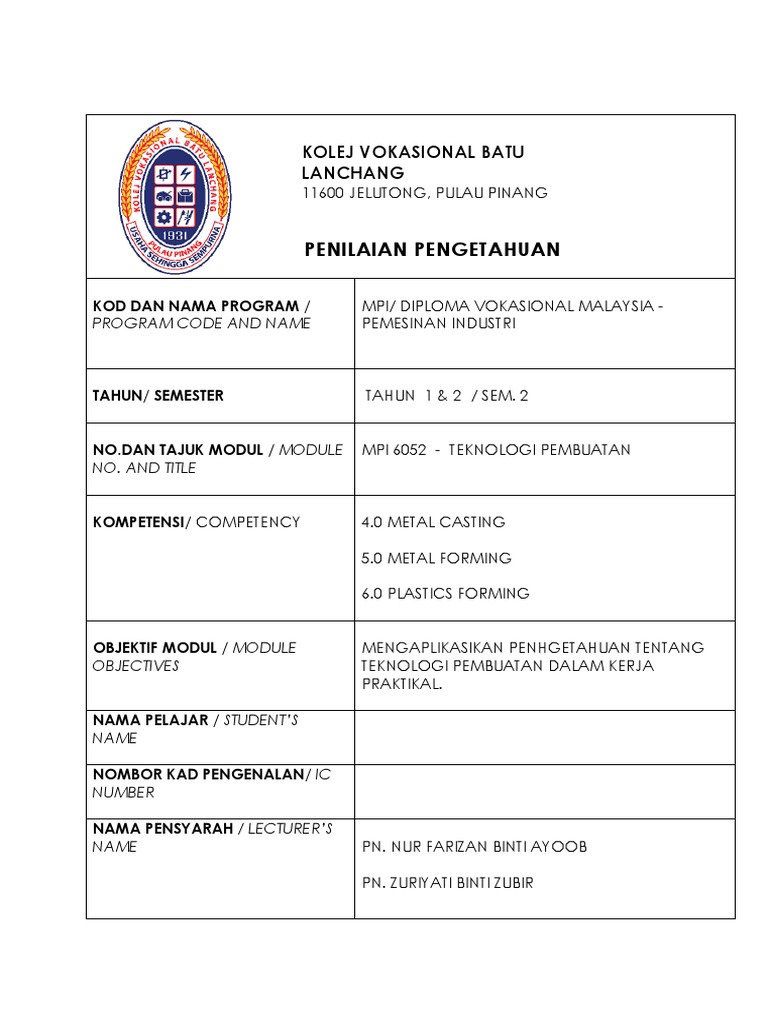 Penilaian Pengetahuan Kolej Vokasional Batu Lanchang