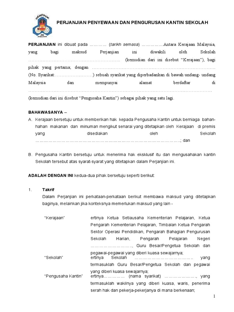 Nama sekolah dan alamat sekolah u p. Nama dan alamat berdaftar pengusaha kantin 18 2 perjanjian ini hendaklah ditafsirkan menurut dan dikawal oleh undangundang malaysia dan kedua dua pihak bersetuju untuk tertakluk sepenuhnya kepada bidang kuasa mahkamah. Perlanjutan perjanjian penyewaan dan pengurusan kantin sekolah perjanjian ini dibuat pada. Jika kesemua atau mana mana bahagian daripada deposit sewa di fasal 6 1 dan deposit bayaran elektrik dan air di fasal 7 2 perjanjian ibu telah digunakan dalam tempoh kuat kuasa penjanjian ibu maka pengusaha kantin hendaklah mengemukakan bagi deposit supaya amaun deposit adalah seperti yang ditetapkan di fasal 6 1 dan fasal 8 2 perjanjian ibu.
