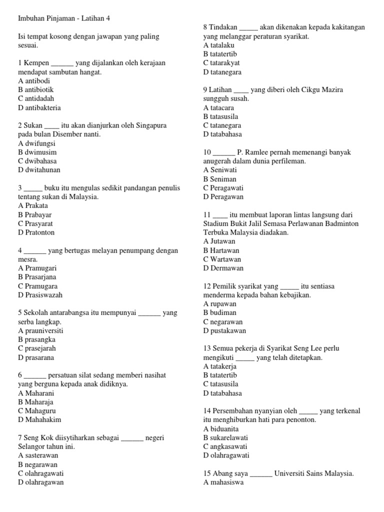 Latihan Imbuhan Pinjaman Bahasa Malaysia Tahun 5